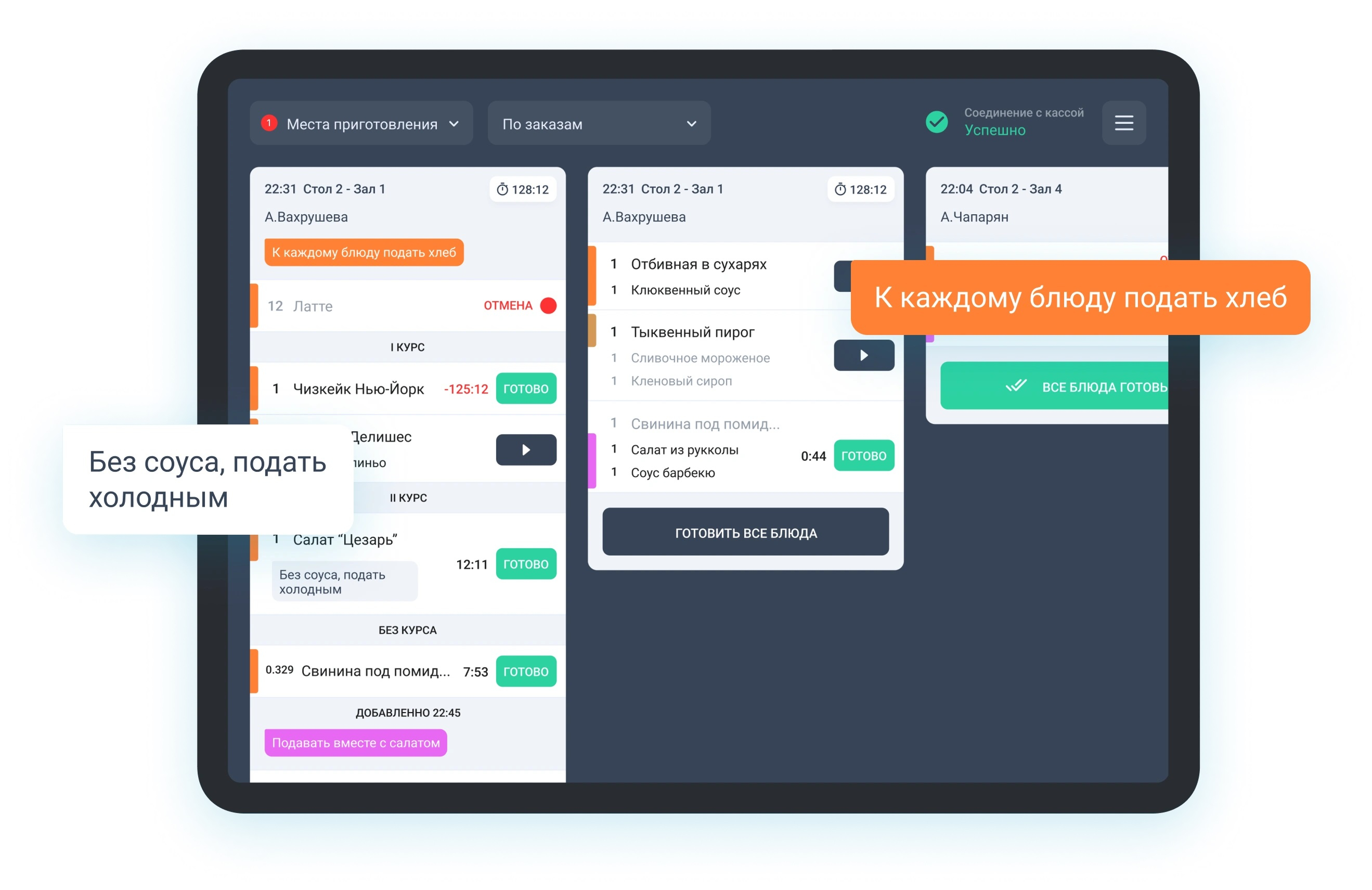 Шеф видит на своём экране статусы всех заказов: что готовится, что уже на раздаче, какие блюда задерживаются. Это помогает равномерно распределять нагрузку между поварами и вовремя реагировать на задержки. Гости получают заказы быстрее, а повара работают без авралов.