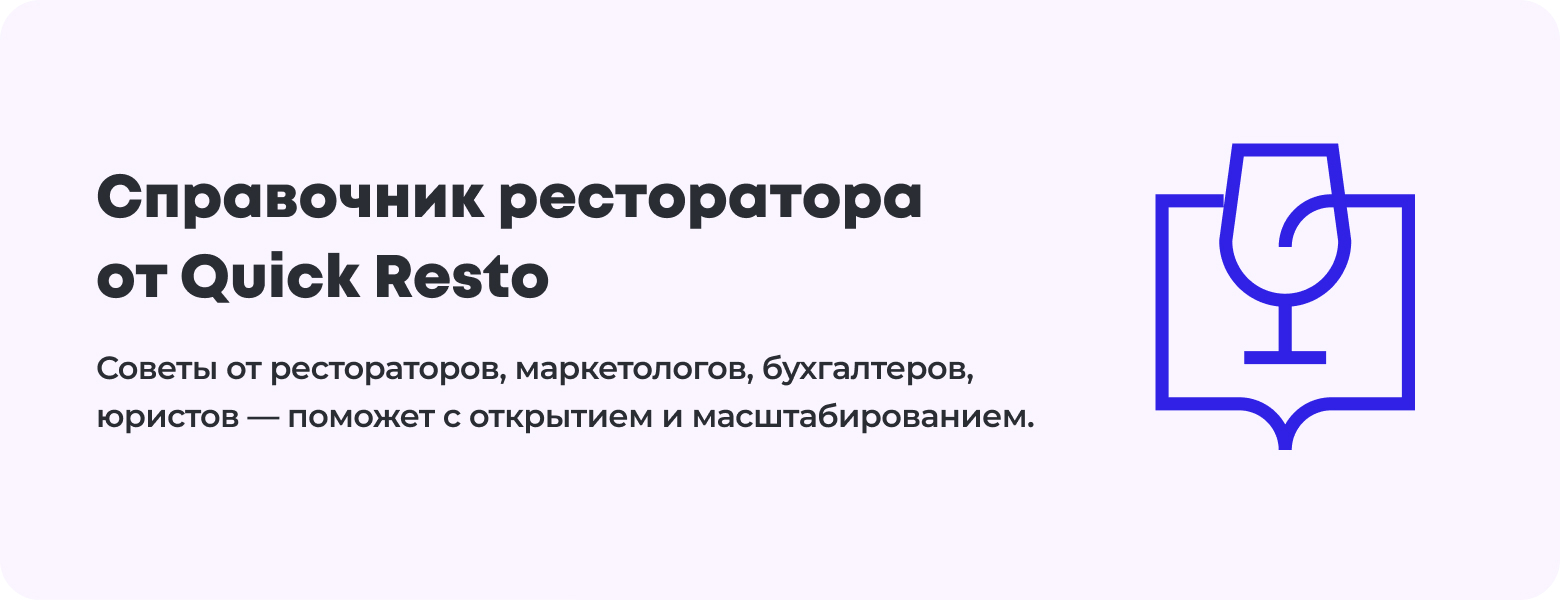 У Quick Resto есть бесплатный справочник начинающего ресторатора. В нём собраны советы от предпринимателей, маркетологов, бухгалтеров и юристов. Это поможет открыть заведение и всё предусмотреть.