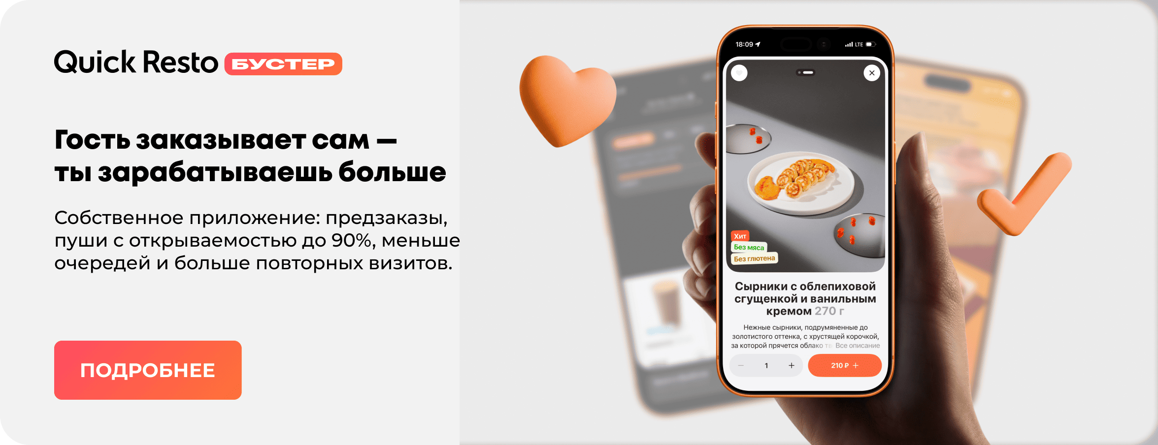Бустер Quick Resto — это коробочное решение, которое объединяет всё необходимое для роста продаж: быстрый повтор заказа, система мотивации, push-уведомления, интеграции с кассой, сайтом и CRM.