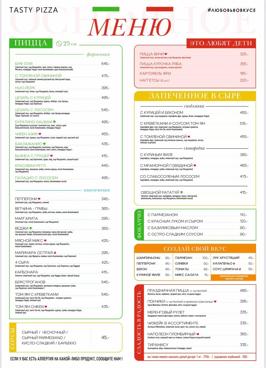 Меню Tasty Pizza построено вокруг пиццы диаметром 25 см и делится на две основные категории: классические и фирменные позиции. В классическом разделе — самые востребованные позиции: «Маргарита», «Пепперони», «4 сыра», «Ветчина и грибы», «Карбонара», «Бефстроганов». Средняя цена пиццы — от 300 до 600 рублей, что позволяет сохранять демократичную ценовую политику и стабильный спрос.