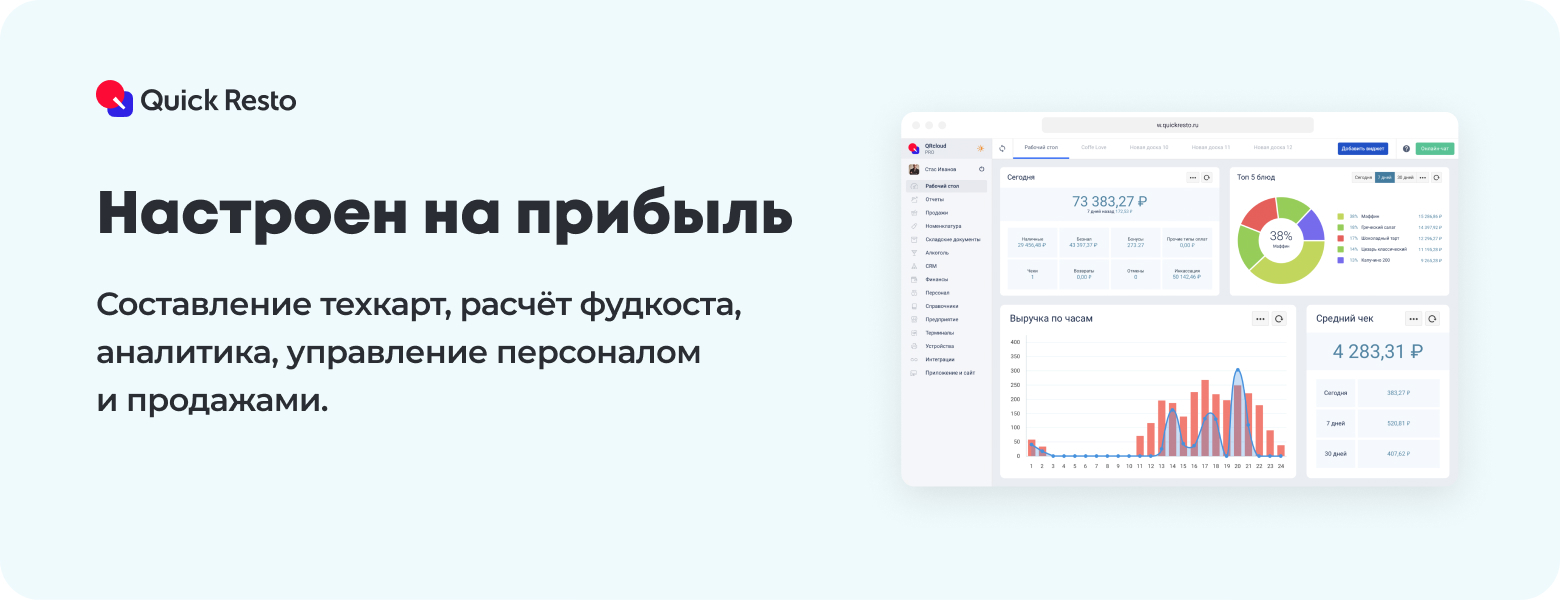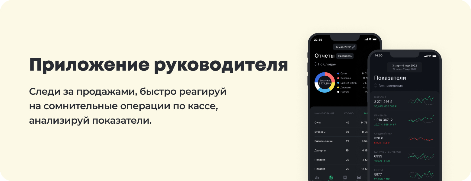 Следи за продажами, быстро реагируй на сомнительные операции по кассе и анализируй показатели в приложении для управляющего Quick Resto Manager. Точные данные о работе твоего заведения в реальном времени. Узнать подробнее